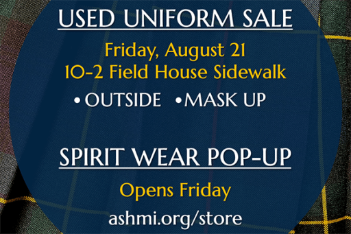 Stop by our used uniform "sidewalk sale" near the Field House entrance on Friday, August 21, between 10 a.m. and 2 p.m. This is a great opportunity to stock up ahead of the new school year! Customers must remain outside and wear a mask. Credit cards accepted. Then, watch for a new spirit wear pop-up coming soon!